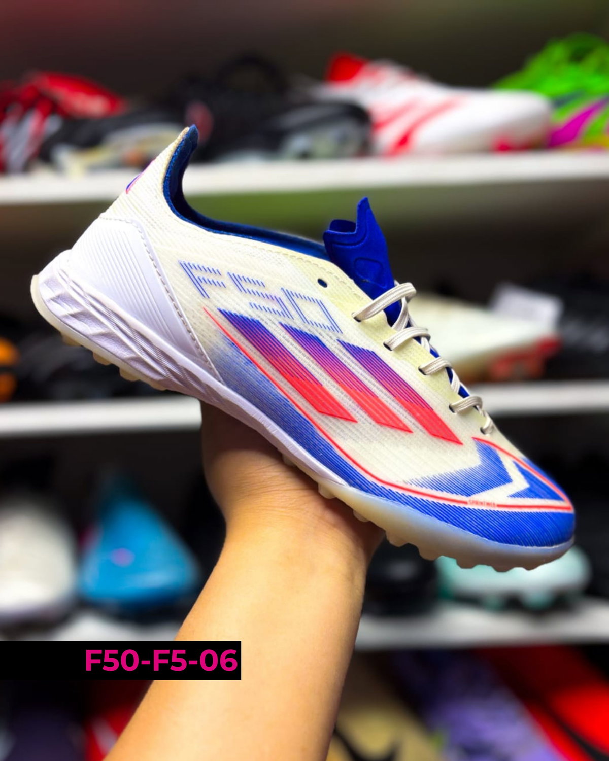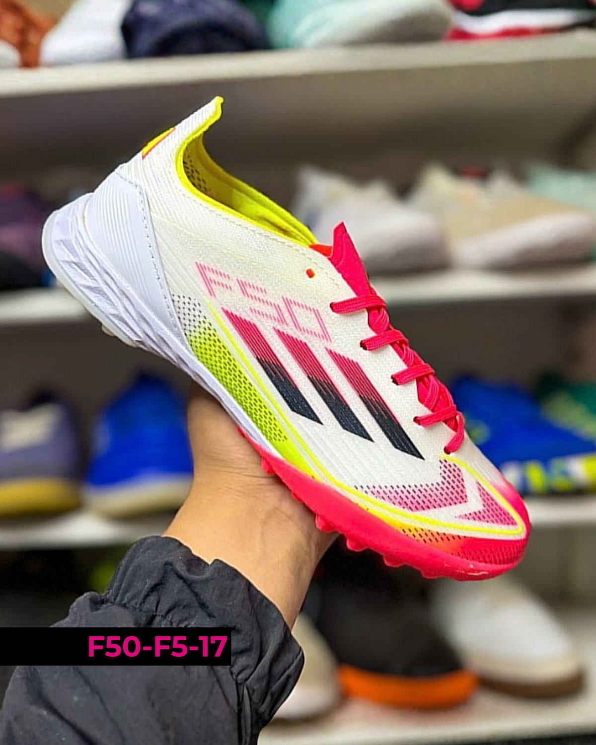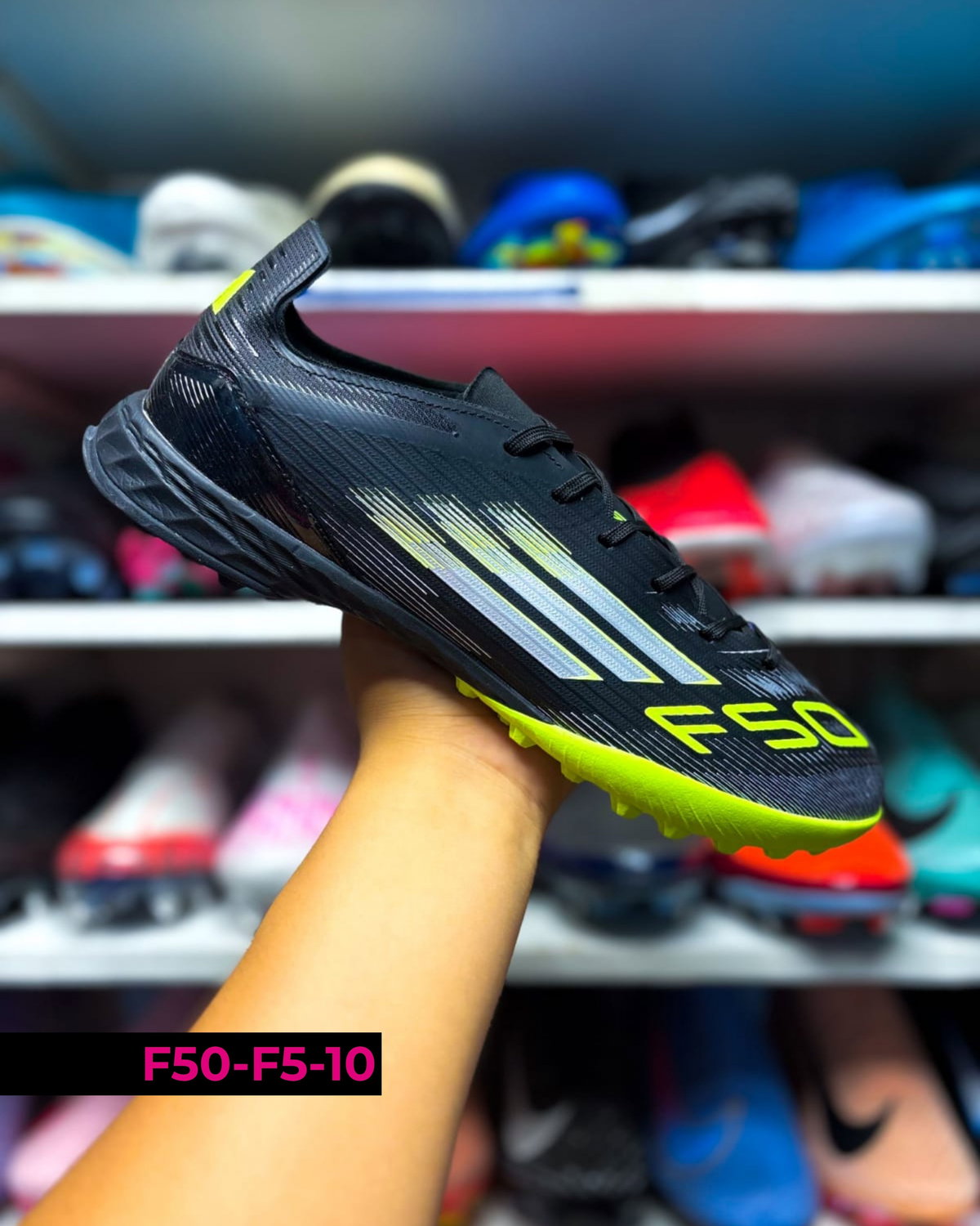Botines Adidas F50 F5 diseñados para fútbol en canchas de césped sintético (tipo turf). Se destacan por su ligereza y ajuste cómodo, permitiendo movimientos rápidos y mayor agilidad en el juego. Su suela de múltiples tapones brinda buena tracción y estabilidad en superficies duras. Ideales para entrenamientos y partidos recreativos, combinan velocidad, control y seguridad en cada jugada